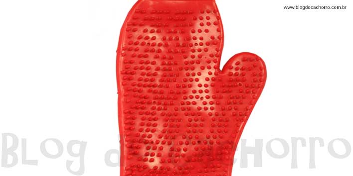 - Escova/luva de plástico – A escova/luva de plástico é um acessório que auxilia bastante na remoção de sujeira e além disso, ajuda tirar parte dos pelos mortos, fazendo uma massagem no cachorro. Particularmente acho um acessório muito útil para dar banho em meus cachorros, já que eles têm pelagem longa e a utilização da luva, retira os pelos soltos diminuindo o tempo de secagem.