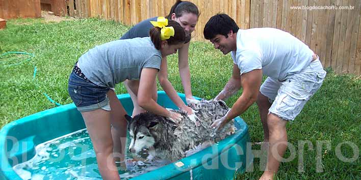 Outro item de grande importância e que não deve ser negligenciado por você, é o local onde irá dar banho em seu cachorro. Principalmente se for o primeiro banho de seu peludo. O ideal é que você tenha uma banheira onde possa colocá-lo em uma água morna, de modo que a água possa cobrir até a altura dos cotovelos de seu cachorro. Se o cão for pequenininho, banheiras para crianças, pias ou até mesmo bacias podem ser uma solução. Também é importante que o local seja fechado, pois caso seu cachorro tente pular da “banheira”, não conseguirá ir muito longe, impedindo que se machuque. Também é importante checar a altura da “banheira”, se ela está firme e outros pequenos detalhes que garantem a segurança em caso de pequenos contratempos. Banhos em locais fechados, permitem que você não utilize acessórios como coleira e enforcador. Isso promove maior conforto e segurança ao animal, fazendo que as chances do banho ser mais bem sucedido sejam maiores. Se você tiver em casa um box fechado e quiser dar banho de chuveiro em seu cão, esta também pode ser uma opção segura para dar banho em seu cachorro.